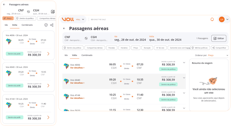 Nesse cenário, a VOLL se posiciona como parceira estratégica oferecendo tecnologia própria que simplifica e digitaliza os processos de viagens, mobilidade e despesas corporativas em uma plataforma end-to-end, com: