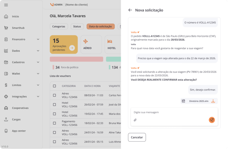 Com a evolução do follow-up, você abre solicitações direto pelo voucher. Isso inclui dúvidas, alterações, cancelamentos e qualquer tema relacionado à sua reserva.
