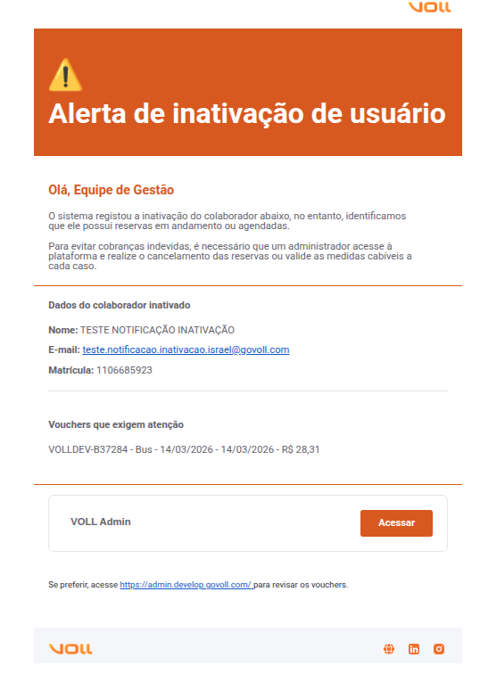 A partir de agora, sempre que um usuário for inativado na plataforma e existir qualquer viagem ativa vinculada a ele, um e-mail será enviado automaticamente para os administradores da conta. Esse aviso permite uma ação imediata e direcionada, sem depender de consultas manuais ou cruzamento de dados.