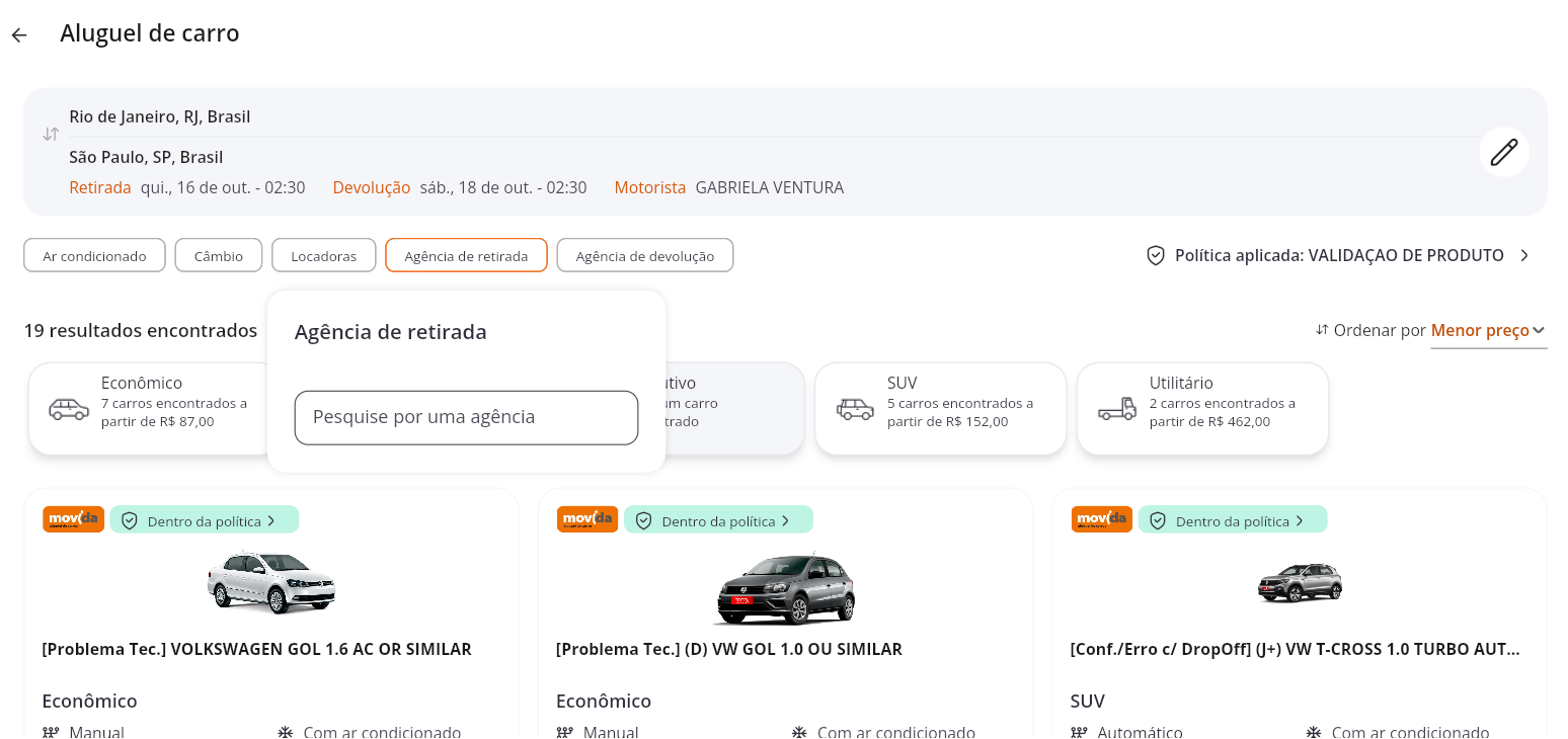 Filtros separados para retirada e devolução: Quando a locação envolver retirada e devolução em locais diferentes, o sistema oferece dois filtros distintos. Assim, você define com mais precisão onde quer retirar e devolver o veículo, garantindo escolhas mais adequadas à sua rota.