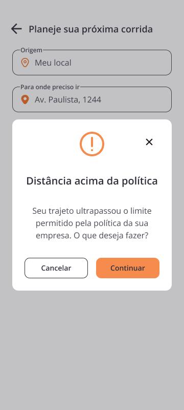 Quando o trajeto ultrapassar o limite permitido, o sistema passa a exibir um aviso para que você decida se segue fora da política.Caso haja bloqueio de uso aos fins de semana, o sistema informa que as solicitações estão suspensas nesses dias.