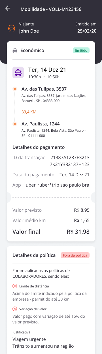 - Limite de distância no Smart Mobility: Assim como no agendamento, você pode definir um limite de quilômetros entre origem e destino. Ao ultrapassar o limite, o voucher será sinalizado como fora da política.